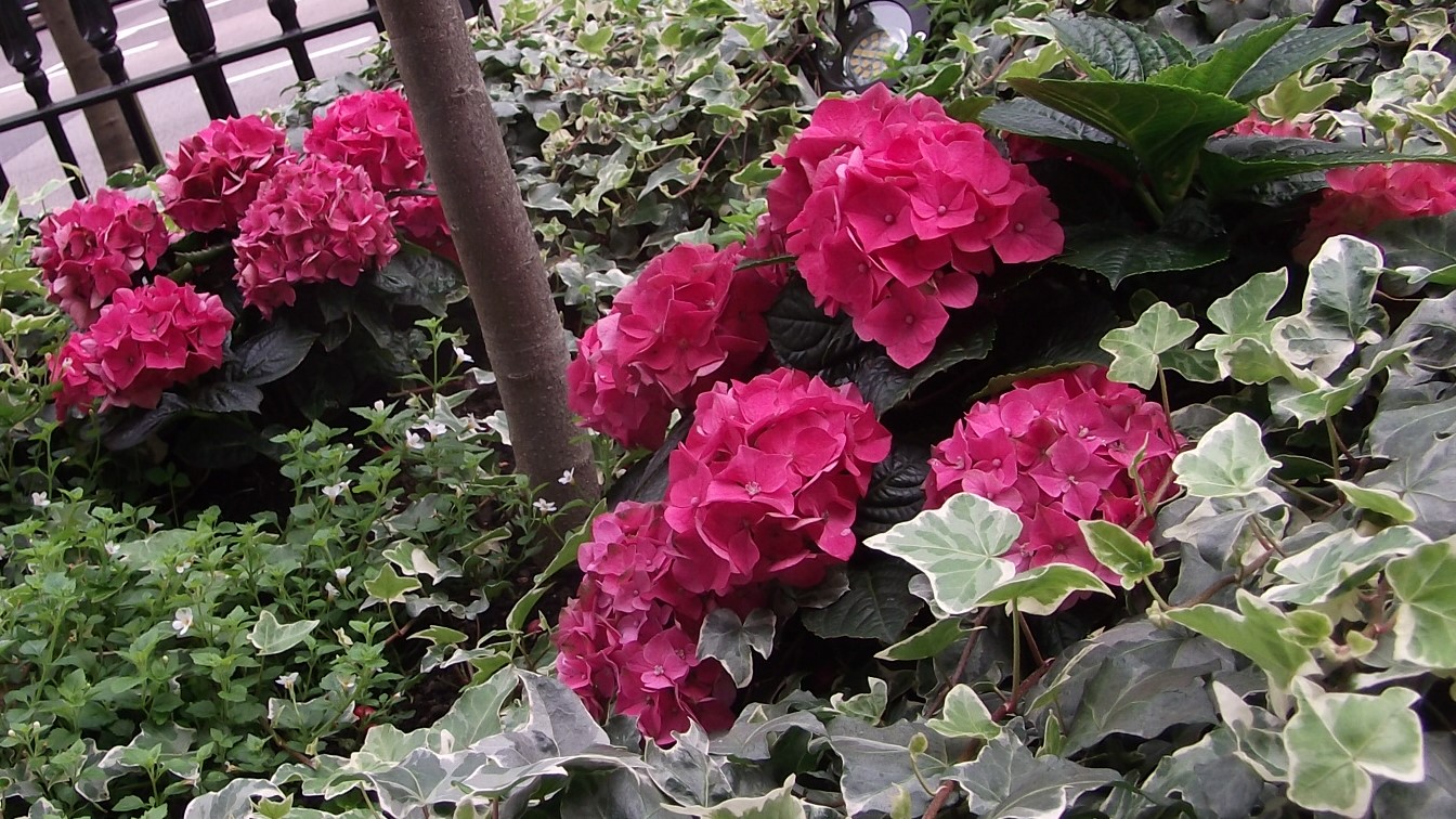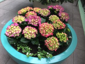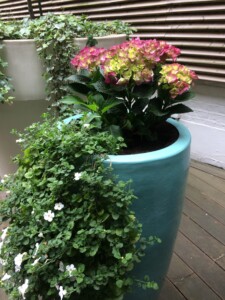Colourful summer and autumn container gardening in jewel pinks for contemporary hotel’s frontage and contemporary courtyard garden